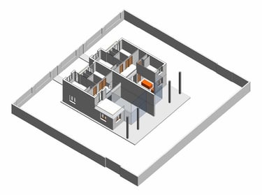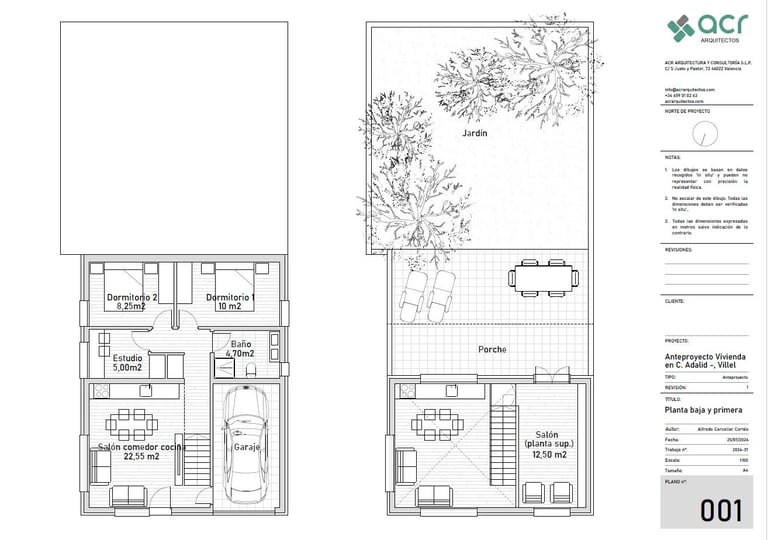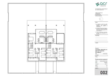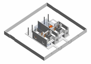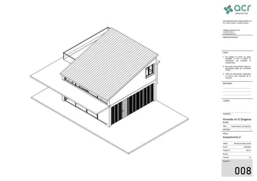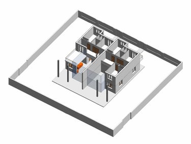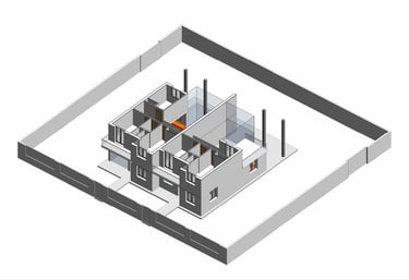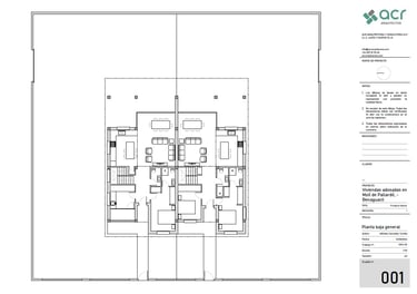 Proyecto de dos viviendas adosadas para unos padres y la familia de su hija. El programa era similar en ambos casos, cuatro dormitorios, estar comedor a doble altura y cocina unida al estar comedor. Sin embargo, los padres querían que dos de los dormitorios estuvieran en planta baja y dos en la de arriba, mientras que en la otra vivienda el dormitorio de la planta baja pasa a ser un gran cuarto de la colada con tendedero y la terraza de la planta superior pasa a ser un dormitorio adicional. Pese a ser un solar plano, la orientación del proyecto viene condicionada por la ubicación de los accesos rodados y peatonales y por las preferencias personales de cada uno, teniendo en el lado norte una vivienda con una luz natural indirecta, y en el lado sur una iluminación más intensa. Se estudia la ubicación de los huecos y las protecciones solares para conseguir el soleamiento mas adecuado para la vivienda.