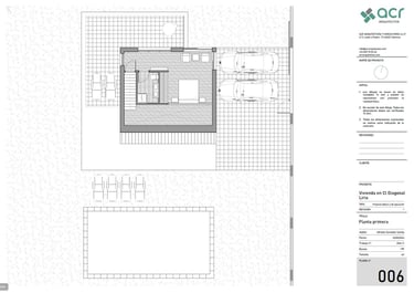 En la planta superior se encuentra el dormitorio principal, con un baño en suite ubicado en el mismo lugar que en la planta inferior y una doble altura que dota al estar comedor de una mejor espacialidad, al tiempo que permite ver desde el dormitorio al salón, sin que desde el salón alcance a verse el dormitorio. Esta planta, bajo un tejado a un agua, ocupa todo el rectángulo sur, mientras que el resto de la planta se destina a una gran terraza para el dormitorio principal.